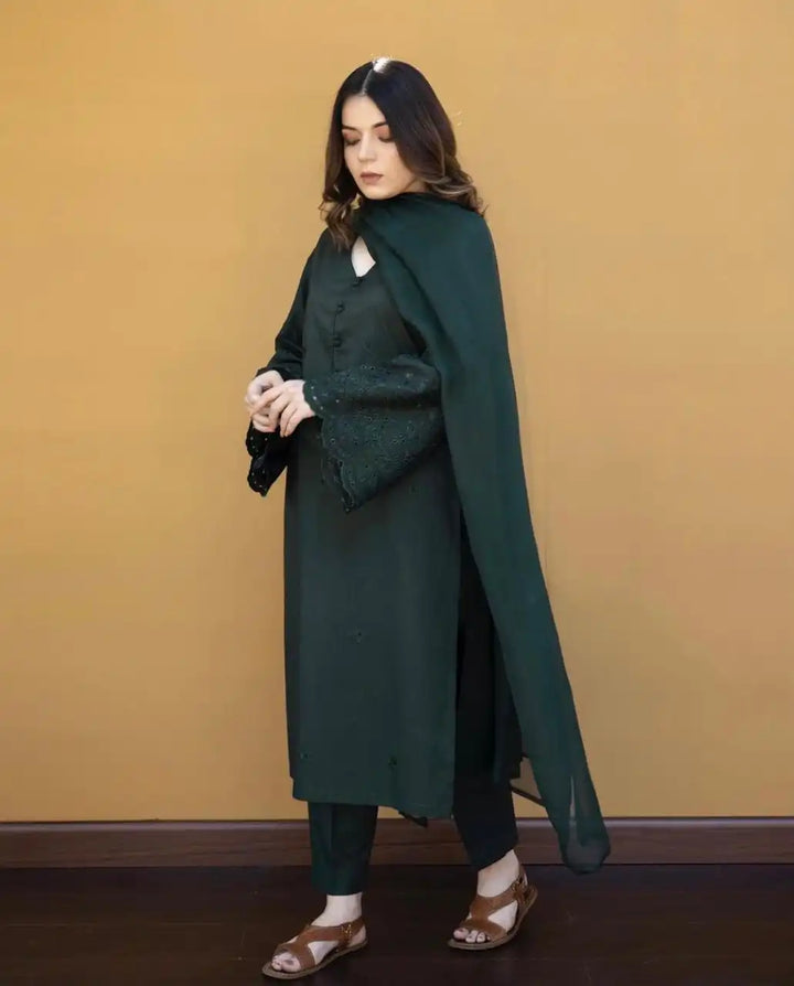 Dhanak-3PC Embroidered Shirt with Chiffon Plain Dyed Dupatta-361